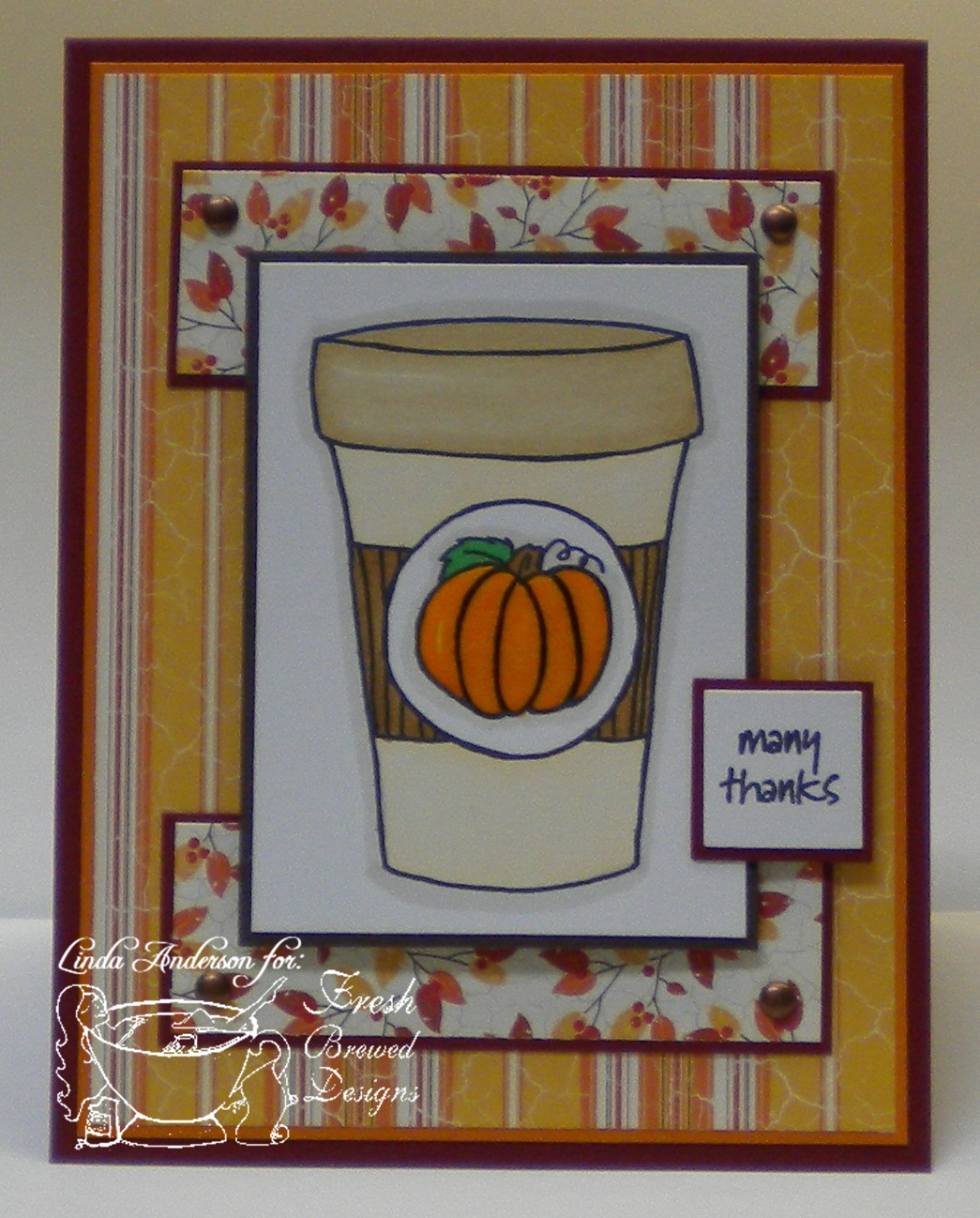 OH LINDA! YOU BAD GIRL YOU!!! I want to go get one of these so badly now! HAHAH!!! it was so cloudy and muggy and icky this morning.. and now it has cleared away and has gotten to (according to the thermometer in my window that IS in the sun) 102 :(( SO it does not feel at all like Fall today. Can't wait for a cool day and a cup filled with yummy Fall flavors. Your card is GORGEOUS!!!!!!
